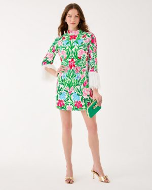 - Long sleeve, easy fit shift romper with a collar, side slits, and faux feather trim at the sleeve hem.