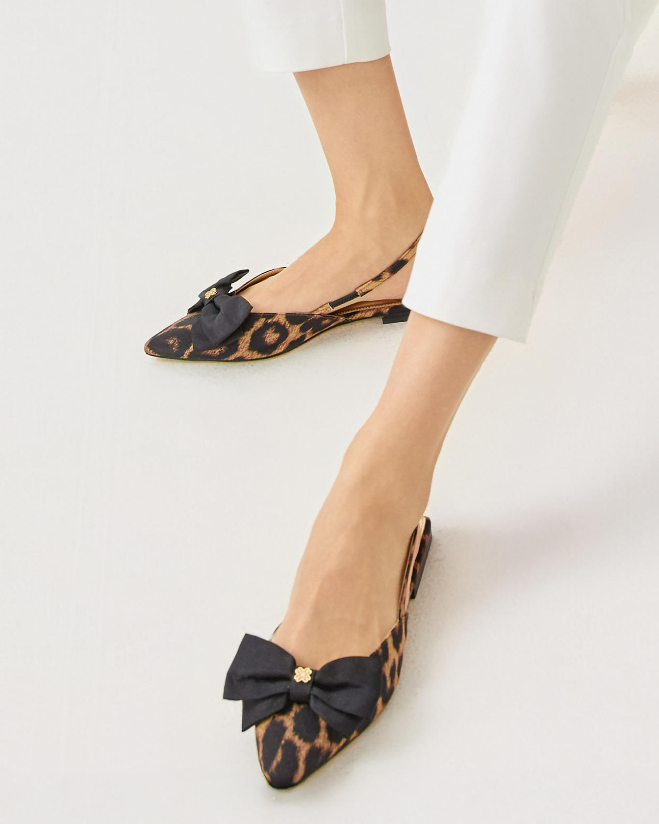 - Leopard printed slingback shoe with a bow detail, pointed toe, and a plush padded footbed.