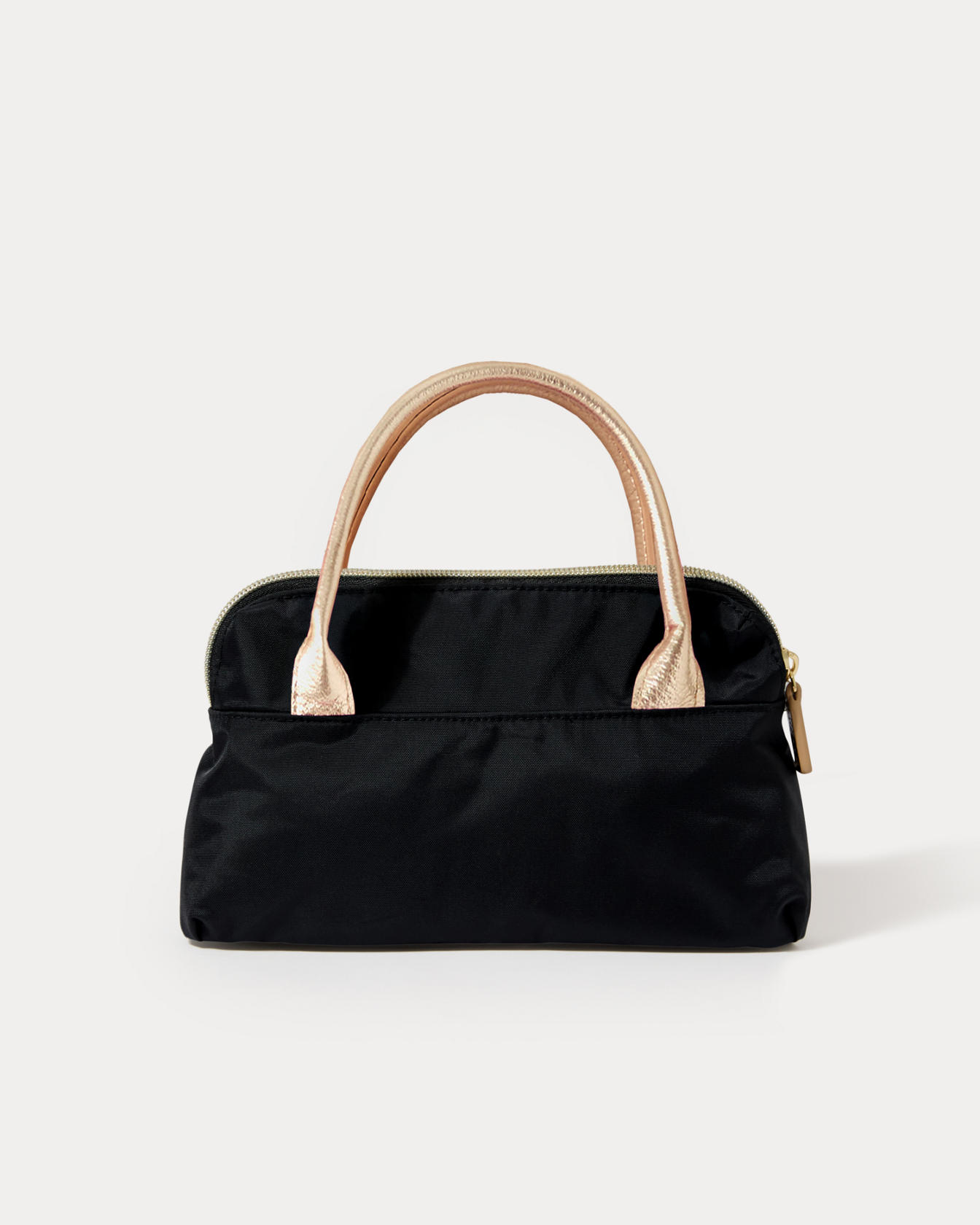 - Nylon top handle mini bag with a front slip pocket, zip top closure, and detachable logo jacquard webbing crossbody strap.
